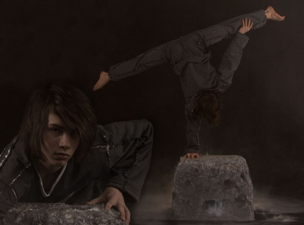 Handstand und Sprungakrobatik mit der kraftvollen Ästhetik eines Steins im Nebel.