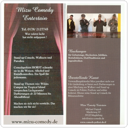 Beschreibung: Komiker, Comedian und Verwandlungskünstler Micha bietet für Betriebsfeiern, Geburtstage, Hochzeiten, Jubiläen und Stadtfesten nicht nur einen sagenhaften Polizisten, der Einlaßkontrollen, Alkoholtests und spaßigen Klamauk ...
