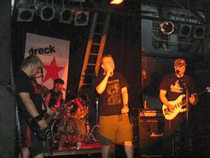 Da nämlich Mario Kalles Anzeige gefunden hatte, führten die Wege des einsamen Bassers mit Proberaum schnurstracks zu der basserlosen neuen Band ohne Proberaum. Schnell und undemokratisch wurde ein Treffen vereinbart, zu dem dann noch ein fünfter und überaus stiller Mensch namens Hensch erschien. Dieser hatte sich in der Zwischenzeit ebenfalls auf Kalles Anzeige gemeldet. Man fand kurze Zeit später heraus, dass es sich bei Hensch ebenfalls um einen Gitaristen handelte. Eine Woche später, bei der ersten Probe kamen dann die ersten beiden Songs, nämlich Anti Bild Song und Shame on you zustande. Nun hatten wir alles zusammen, sogar einen Gitarristen mehr, als ursprünglich angedacht, bloß noch keinen Namen. Es kam jedoch ein mittelgroßes Unglück über die namenlose junge Band: Der Basser verdrückte sich für geschlagene 3 Wochen in den Urlaub! Lange genug, um 4 oder 5 neue Songs entstehen zu lassen, und vor allem um den Namen des Bassers zu vergessen. Man einigte sich auf Karl Heinz oder kurz Kalle als neuen und wahren Namen. Es gab also einiges an Neuigkeiten, an die der urlaubserholte und zugegebenermaßen erstaunte Kalle sich gewöhnen musste. Ein Name für die Band fehlte jedoch immer noch. Jeder überlegte sich an die 30 Namen und dann wurde alles in einen Topf geworfen, um sich auf einen zu einigen. Ein eher sinnloses und erfolgloses Unterfangen, da wir uns nicht einigen konnten. Eines schönen Tages während des Autofahrens im Berufsverkehr kam Andi dann mit -Dreck am Stecken- der fehlende Geistesblitz. Alle waren mit diesem schicken, mehrdeutigen, vielfach interpretierbaren und provokanten Bandnamen einverstanden.