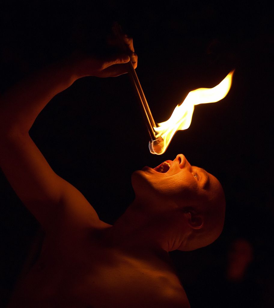 Ralf Brehm prüft zunächst seine Haut auf Feuerfestigkeit. Nachdem er dann einiges an Feuer geschluckt hat, spuckt er es danach in großen Fontänen wieder aus und entflammt dabei je nach Event Jubiläumszahlen, Firmenlogos, Sterne oder Herzen.