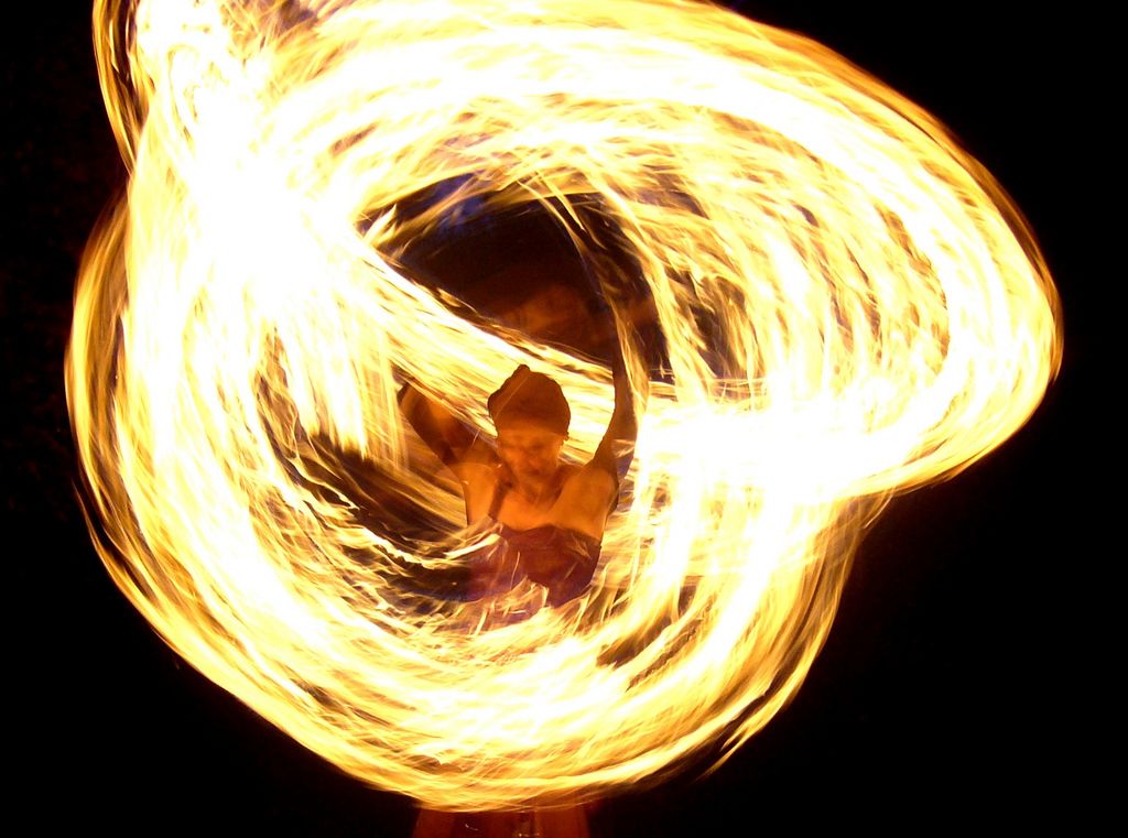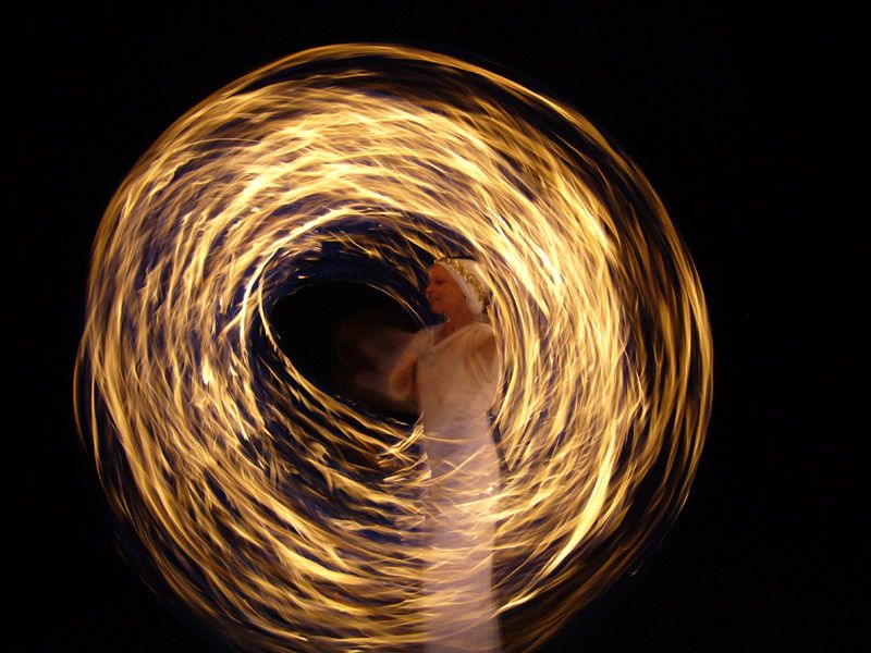 Nicole Dillmann tanzt mit dem Feuer und wirbelt dabei brennende Fächer, Stäbe, Fackeln und Seile durch die Luft. Wunderschöne