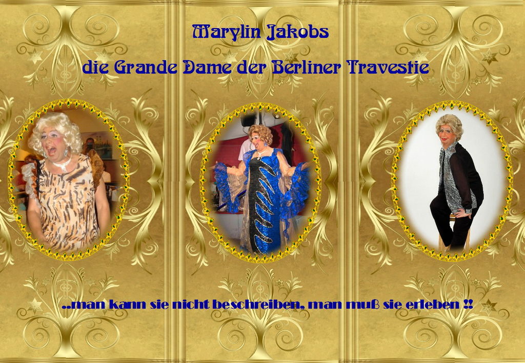 Beschreibung: "Marylin Jacobs- der Grande Dame der Berliner Travestie“ ……..man kann sie nicht beschreiben – man muss sie erleben…..!!!! Wo Marylin Jakobs erscheint erleben Sie ein Feuerwerk der guten Laune, eine witzige und ...