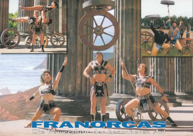 Eine Kraftjonglage der besonderen Art. Bis zu 30 kg schwere Wagenräder brechen die Gesetze der Schwerkraft. Sie werden durch zwei herkulische Athleten durch die Luft gewirbelt.