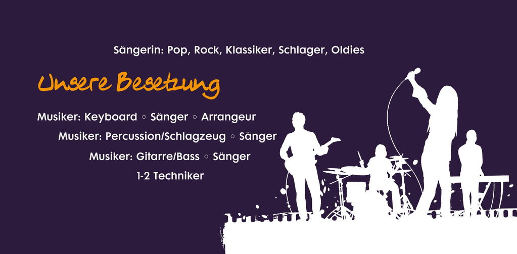 Unsere langjährige Erfahrungen in allen Veranstaltungsbereichen sind der Garant für gelungene Veranstaltungen. Ein gepflegtes, angepasstes und elegantes Erscheinungsbild ist für uns selbstverständlich. Profitieren Sie von der Erfahrung einer Band, die in Sachen "Veranstaltung" nichts dem Zufall überlässt.