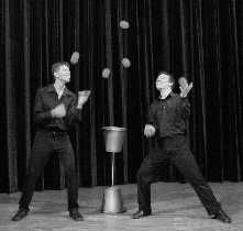 Mit gleich zwei Eimern voller Ideen überraschen die DominiX in ihrer witzigen Ballnummer das Publikum. Die kompliziertesten Varianten des Bällediebstahls wechseln sich ab mit vollkommen synchron vorgeführten Kunststücken. Und wenn am Ende alle 10 Bälle wieder im Eimer versammelt sind, werden auch die Gäste Ihrer Veranstaltung höchst erstaunt versuchen nachzuzählen.