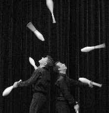 The DominiX präsentieren in einer rasanten Choreographie raffinierte Wurfkombinationen: Immer mehr Keulen wirbeln durch die Luft - und die DominiX lassen nebenher noch lässig einen großen Gummiball von Kopf zu Kopf ...